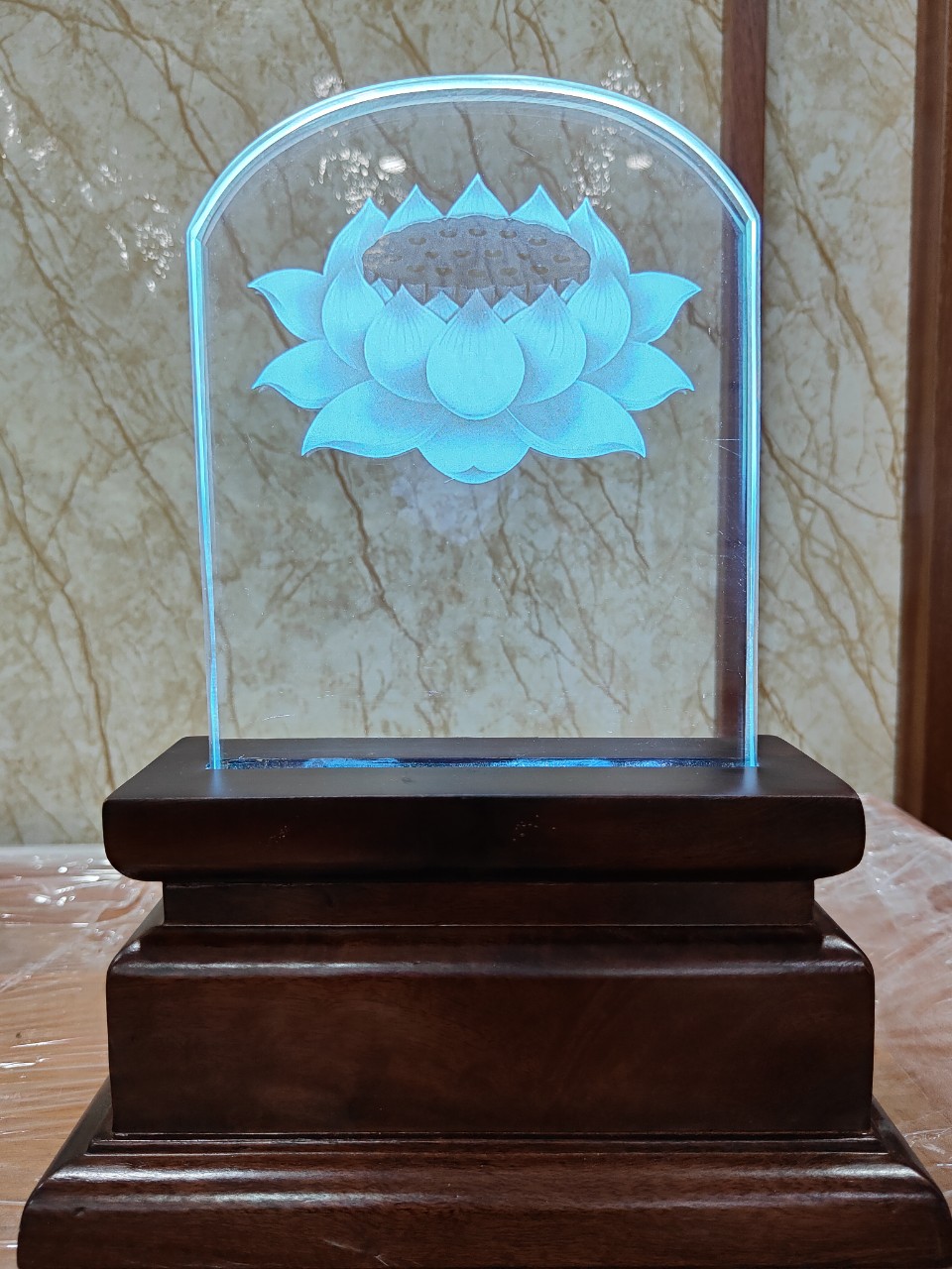 – Chất liệu: Pha Lê khắc hình laser (hai góc phía trên bo tròn như hình thực tế)